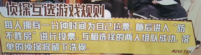 吴彤:通过刚才的绝密测试任务,大家己经对彼此的侦探能力有一个初步的了解了,接下来就进入一个侦探互选环节