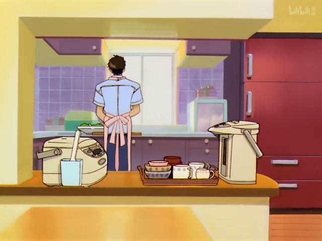 木之本桃矢在房间里做早饭,神野结香和木之本樱一起从楼上下来。