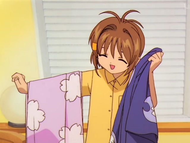木之本樱拿着和服展现在神野结香的面前,犹豫不定的不知道在晚上的夏日祭穿哪一件。
