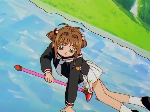木之本樱坐在魔法棒上,和李小狼分别躲避着砂牌,只不过每次都险些才避过去,这让木之本樱开始郑重起来。