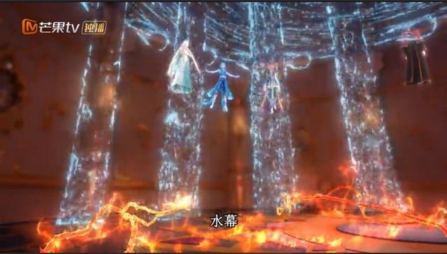 灵犀阁之中从天而降许多水柱,这些水柱连起来,形成了一道水幕,熄灭了火领主的火焰