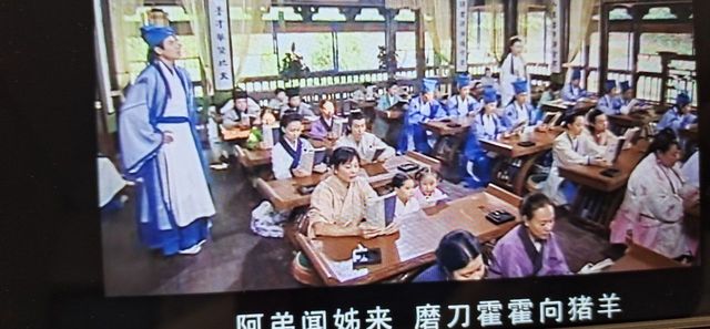 谢渔连忙往学堂赶,就看见一大群老爷们坐在学堂外几米远的看台上
