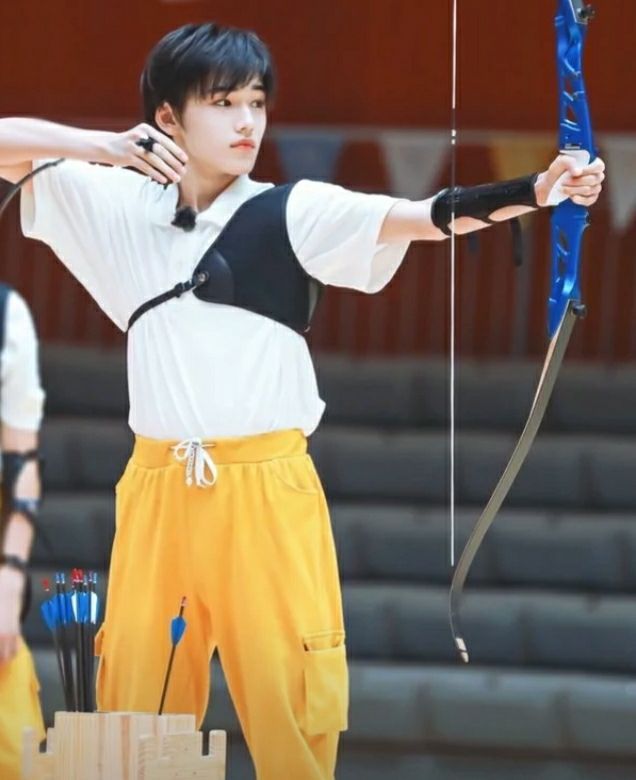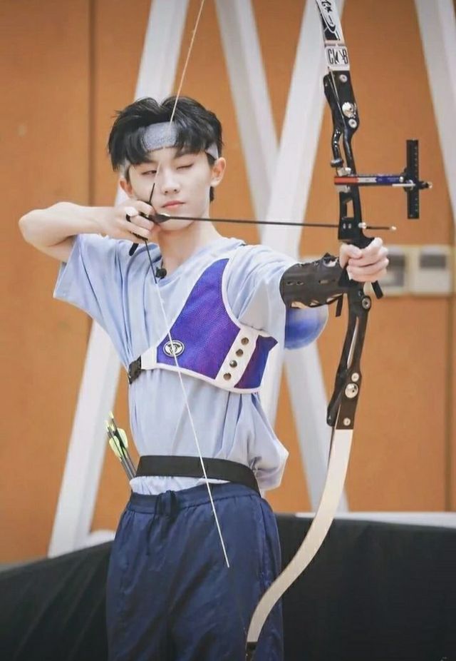 刘耀文左手握着弓,将它竖在地上,拿在手上的一根箭架在握弓的手上,箭尾卡在弓弦上,另一根夹在这只手的无名指与小拇指之间。然后缓缓起身,然后左脚固定在前,右脚笔直的向后滑,找到合适的站位。随即用手托着箭并注视着它,确保箭放直。