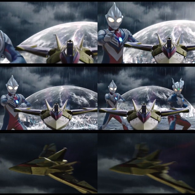 在迪迦抵御着敌人光束的时候,我们的泽塔也趁这个时机飞跃而上到高空中——