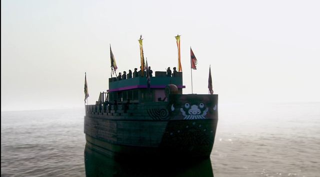 船上旗帜鲜明,军容整肃壮观,显然每个人都是久经风浪能征善战的海上健儿。