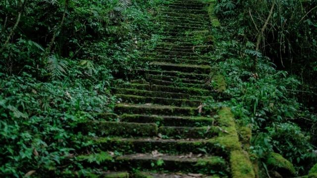 台阶上面有很多青苔。