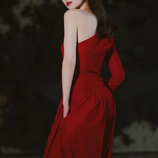一头黑发自然披在双肩,黑色和红色的颜色冲击使皮肤显得更白皙,笔直纤细的长腿踩着一双高跟鞋,好一个人间尤物。