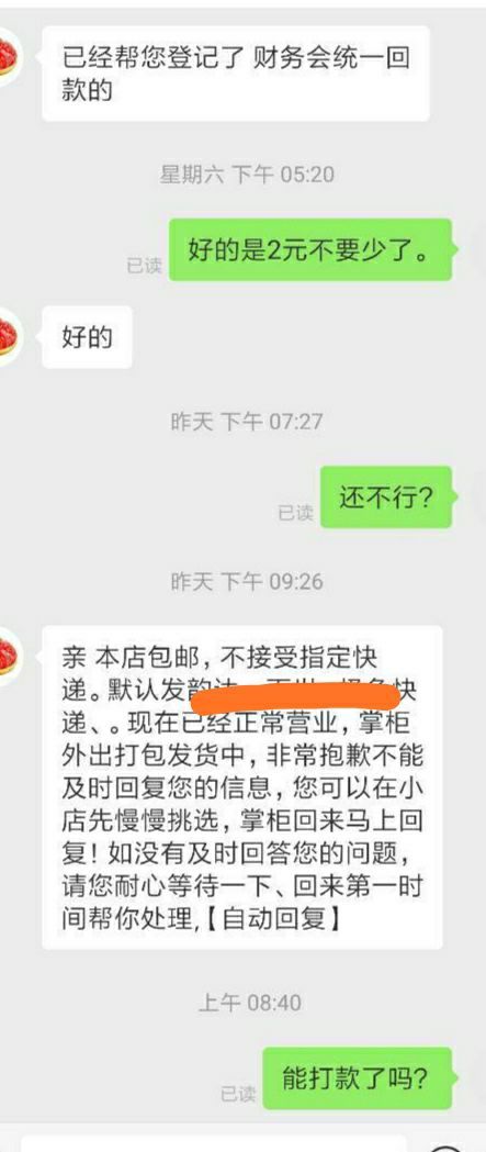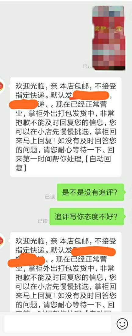 商家明明已读了,还说外出打包发货,后面还添加[自动回复],搞的我自己以为真是自动回复呢!