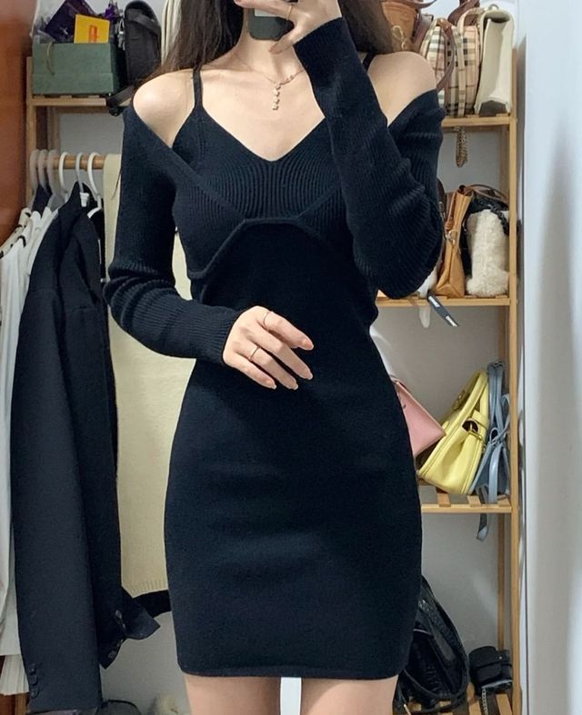 你穿着一件黑色修身的连衣裙,高领上挂着一层层黑珍珠。