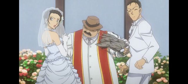 已经来不及了,‘歹徒’的枪指着新娘。新娘想逃走可因为婚纱太过大,导致行动不便,枪对准了新娘,高木冲到美和子身前】