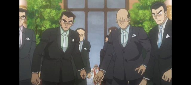 假扮司仪的目暮警官,带上他的帽子,弄掉伪装,把假发什么的人在一边,伸出手指在他们,大喊道