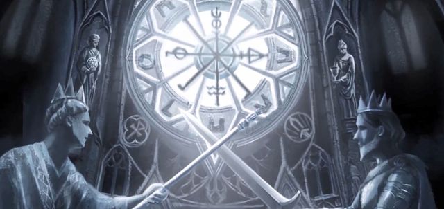 两方阵营正逆序分别站在左右两侧,每个人手中都拿着一根白蜡烛,两方国王分别有两张正对的椅子,侍从站在国王两边,骑士在国王前旁方。