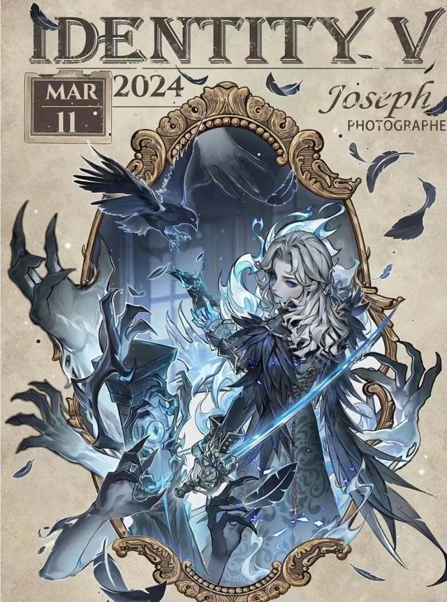 披风不断有羽毛飘落,脸部有蓝色荧光破碎效果。相片上有流光特效,颜色更加深邃。