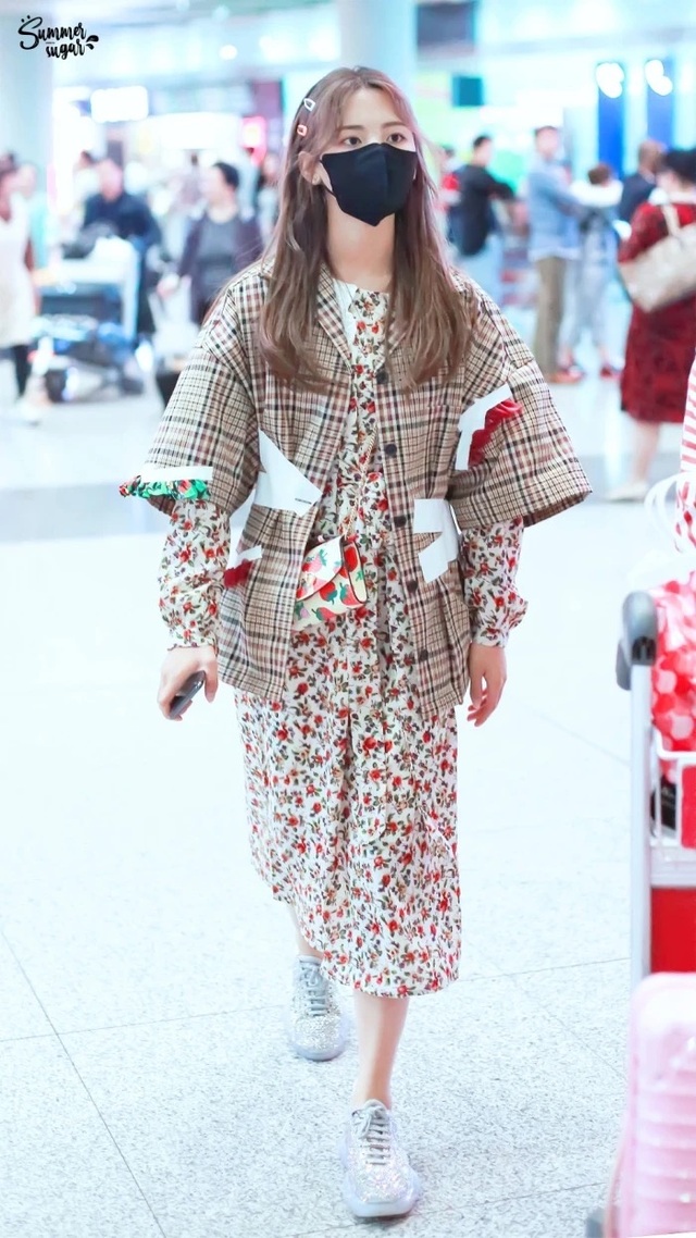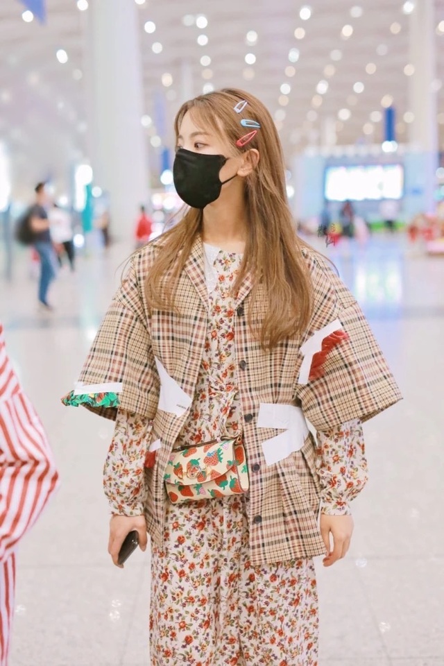 女人穿着一身花里胡哨的小红花在忙碌的机场游荡