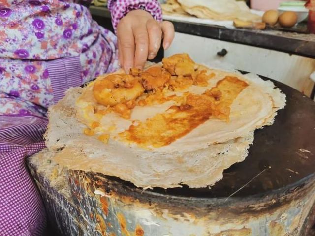 一小坨面团在平底镬上制成似纸薄的面皮,加上鸡蛋、油豆腐、茶叶蛋等各种心仪配料,再刷一层甜酱。