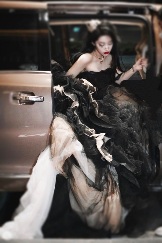 一辆车行驶进来,车上下来一个女孩子走上了红毯,她身上穿着一件黑白纱裙的礼服,脚下踩着一双高跟鞋,长发如墨,烈焰红唇,显得格外的冷艳。