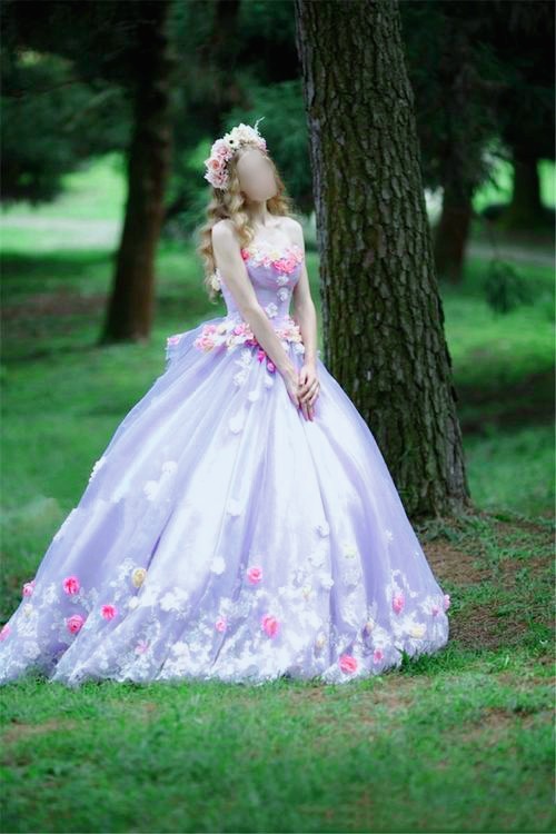 张远:第二套是紫色的连衣裙,上面还带有一些鲜花,还有鲜花的头饰,特别的漂亮