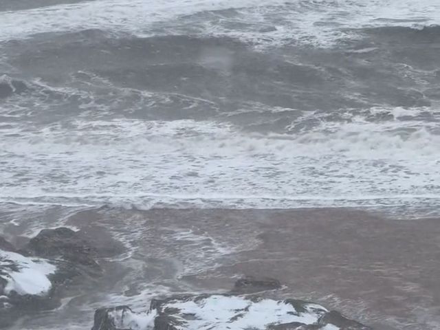 岸边的礁石已经积了些雪,海浪不知疲倦地拍打着沙滩。