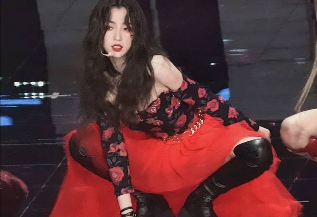 严涵欣穿着红黑色前短后长的蓬蓬裙,一字肩上衣上印满了玫瑰
