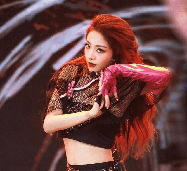 安苒穿着黑色短上衣和紧身黑裤,腰间带着裤链,红发宛若野心勃勃的狼