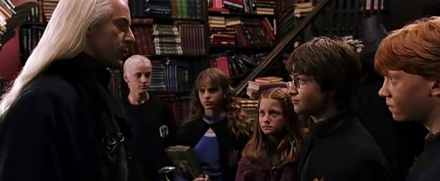 哈利正和一名成年巫师对峙着什么,那个成年巫师看样子应该是德拉科的父亲,因为他们有着一样的发色和专属于他们家的气质。