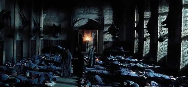 他挥了挥魔杖,长桌就都飞到礼堂角落靠墙那里了,再挥一下,地面上就铺满了成百上千个紫色的睡袋(很符合邓布利多教授的审美)。