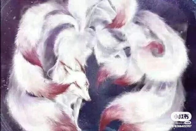 这是一只九尾狐身形妖艳细长与普通狐狸不同的是,它有九条尾巴每条狐狸尾巴末端就有一撮红色的毛,而额头上也有一个红色印记