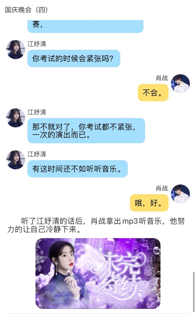 江妤清好啦,还有几分钟国庆晚会就开始了,我们该回去了。