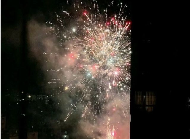 阳台,一对老人,手紧紧的牵在一起,他们看着天空中绽放的烟花。
