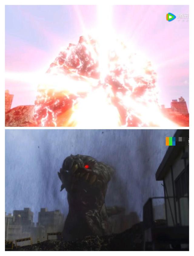 另一边圣彰人和静间结名在地震后出来特利迦和魔兽飞来掉下来的城市