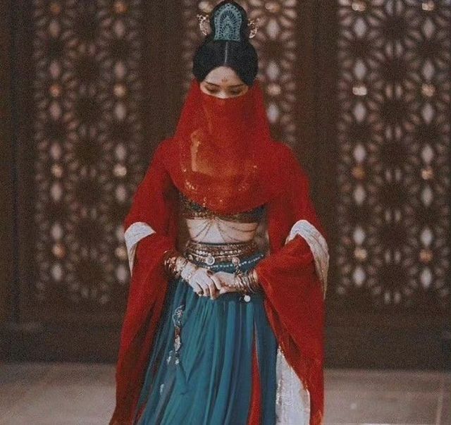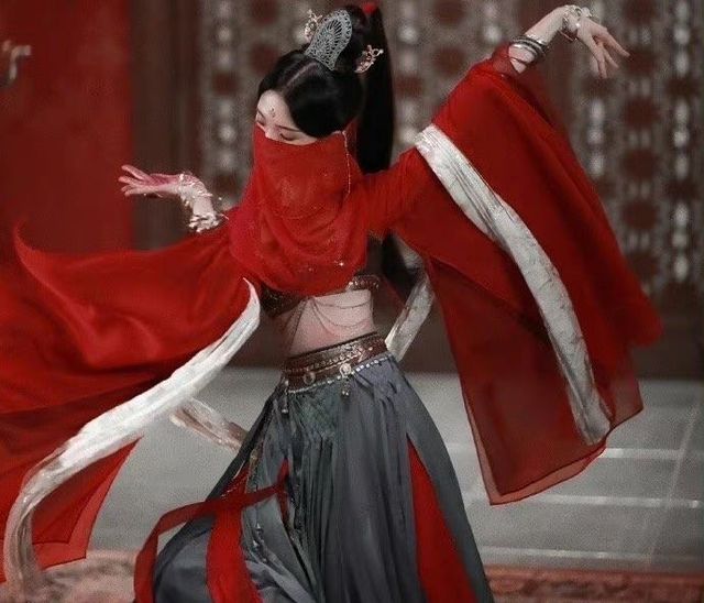 卿窈一身服饰颇有异域风情。她腰身纤细,身形微晃,只是轻轻一转,缎带也跟着舞动,交织旋转,宛似风中一朵荷蕖,婀娜多姿。蒙着的红色面纱也是点睛之笔,增添了一丝神秘的气息,朦胧感十足。