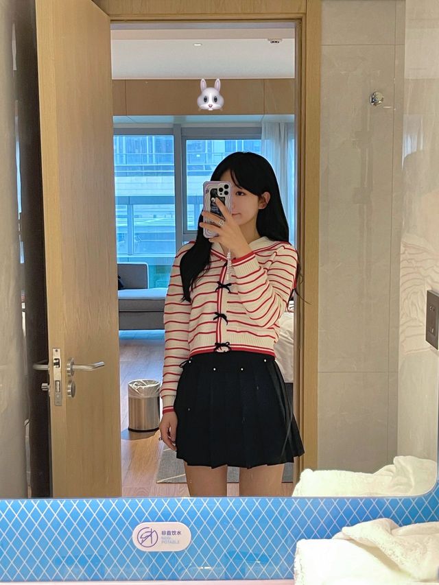 沈偌颐穿了一个红纹上衣和黑色小短裙
