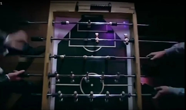 夜晚,汉堡店,坤中和北淼正在玩桌上足球