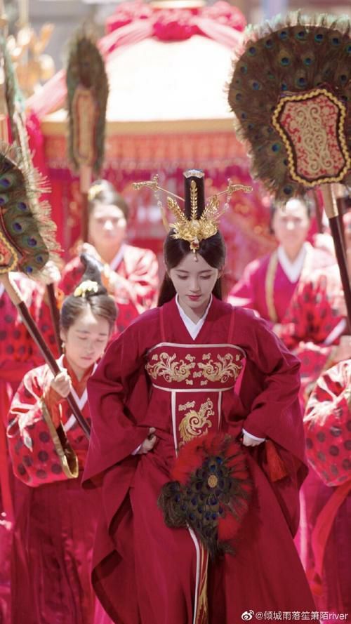 女子一袭红衣,手持孔雀羽翎扇。长发飘飘自带仙气。耳垂悬挂的琉璃血月珠,更是添加了一份美感。
