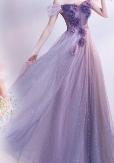 裙边镶着紫色的纱在吊带上还两边各有一条蝴蝶结,在胸前还有一朵紫色的大花,紫色的绸带,穿上去,不知道会有多好看……