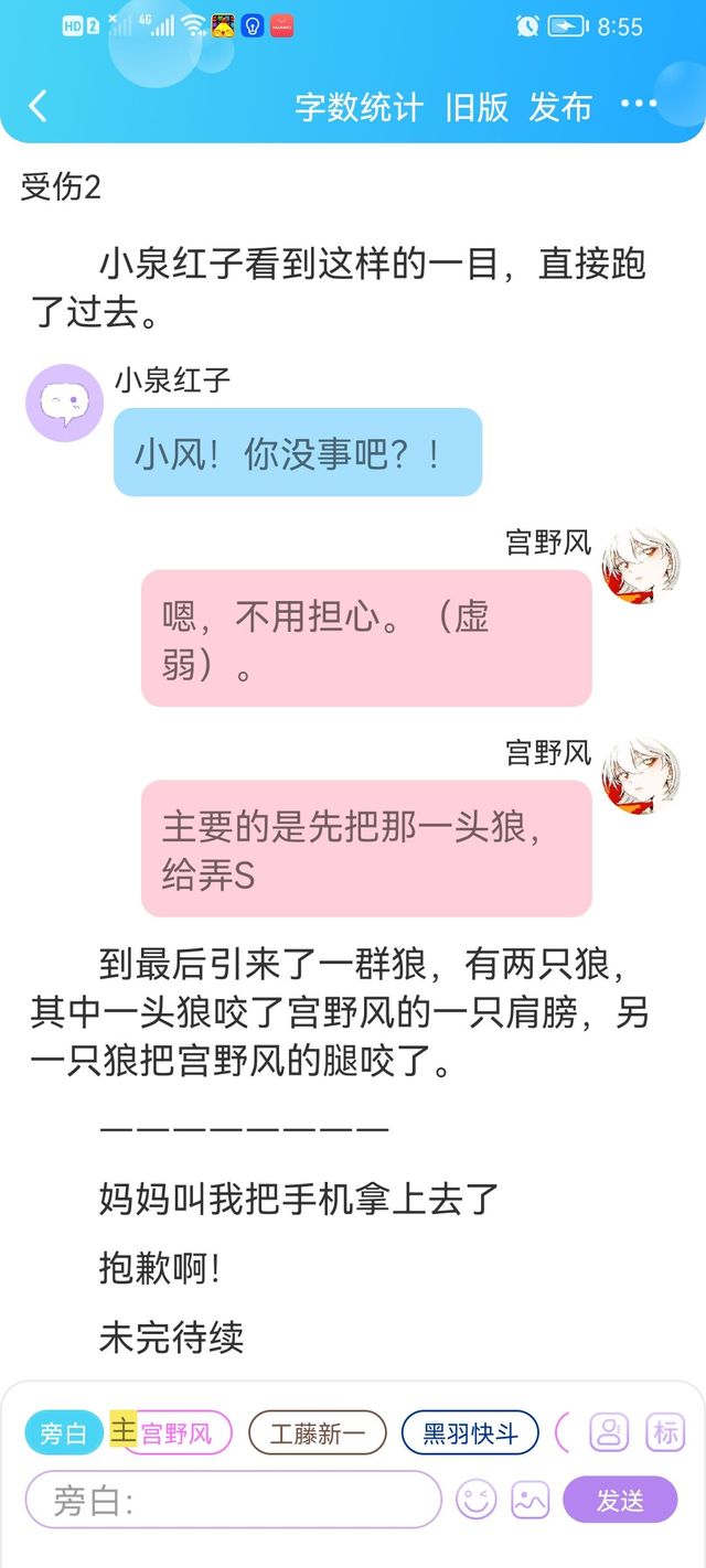 小泉红子就是,小风说去森林里狩猎狼,到了那里之后,却有许多狼把我们包围住了,结果小风为了保护我和叶子,就受伤了,不过腿部的伤是小风没注意,才被狼咬伤的。