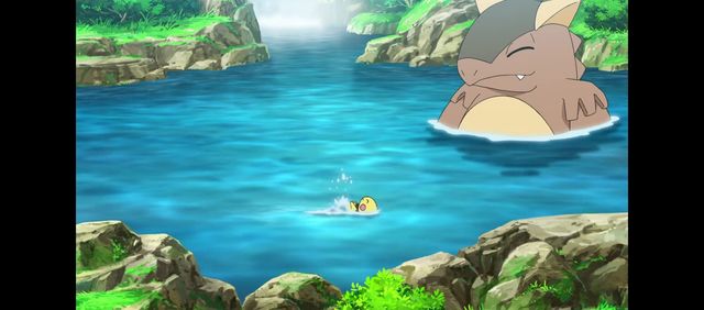 皮丘和袋兽宝宝在水中嬉戏,袋兽就在一旁(泡澡?)