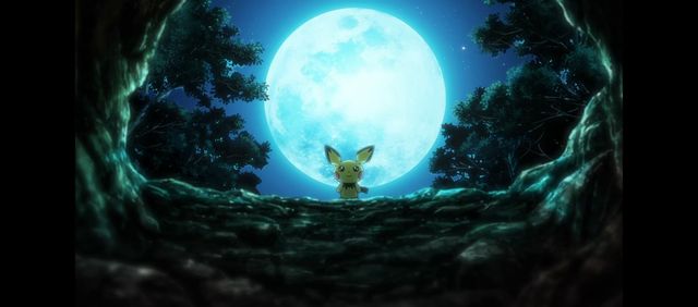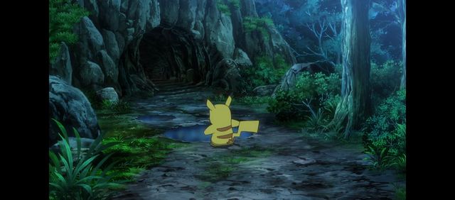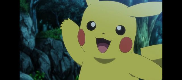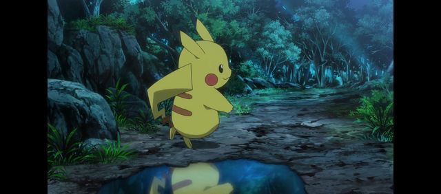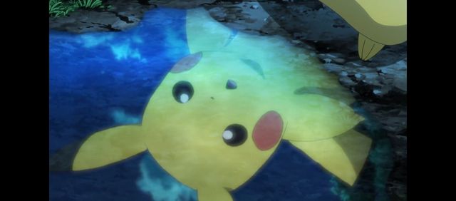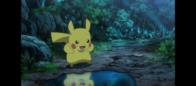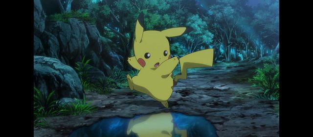 皮卡丘看着水中倒影着的进化后的自己转了一圈又蹦跶两下(动漫里超可爱!)