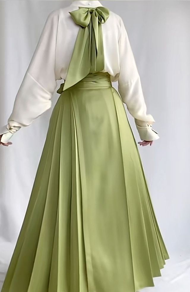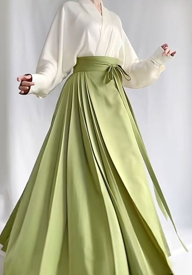 使用变化术转身变了个人似的,头发变黑扎起马尾辫,身着装白色宽松衬衫与纯色的嫩绿色马面裙。