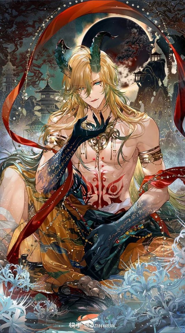 那是一个长相十分俊美的男子,一头金色的头发,发尾有些绿色,一对渐变绿色的犄角长在他的额头之上,脖子上戴着一个金色带流苏项链,项链的正中间镶嵌了一颗红宝石,那个男人手臂从关节处到手是墨绿色的,墨绿色之上还带有金色的符文他下身穿着金色衣物,肚子上有红色的符文,让人觉得诡异,但又挑不出任何的矛盾