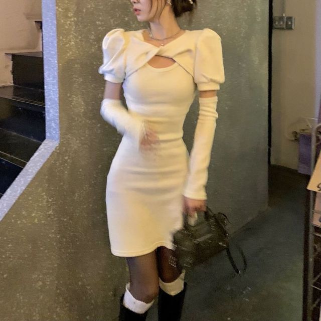 纯欲甜辣泡泡袖包臀短裙+白色新厚底长筒靴