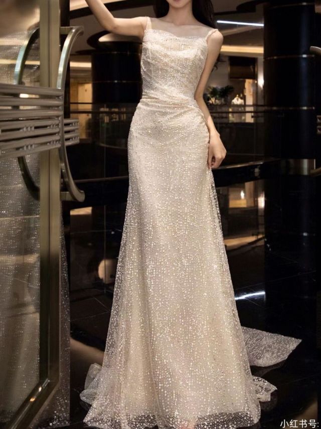 虞九甜身穿一身白色亮片吊带拖地长裙,更好的显示出了她那能放硬币的小锁骨和那迷人的腰线(图来源于小红书 )