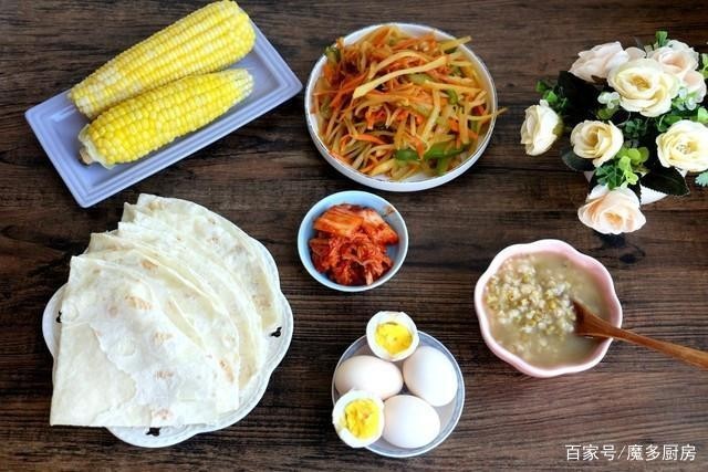 绿豆麦仁粥、烙馍、胡萝卜炒土豆丝、玉米、鸡蛋、辣白菜