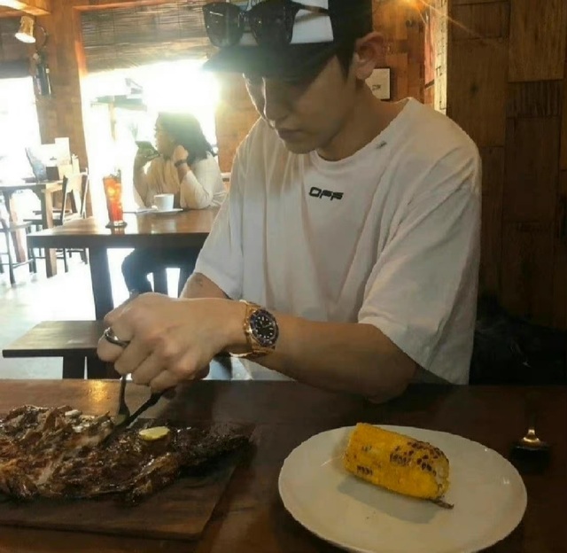 朴灿烈正用杨泽安塞给他的刀叉切着整块牛排