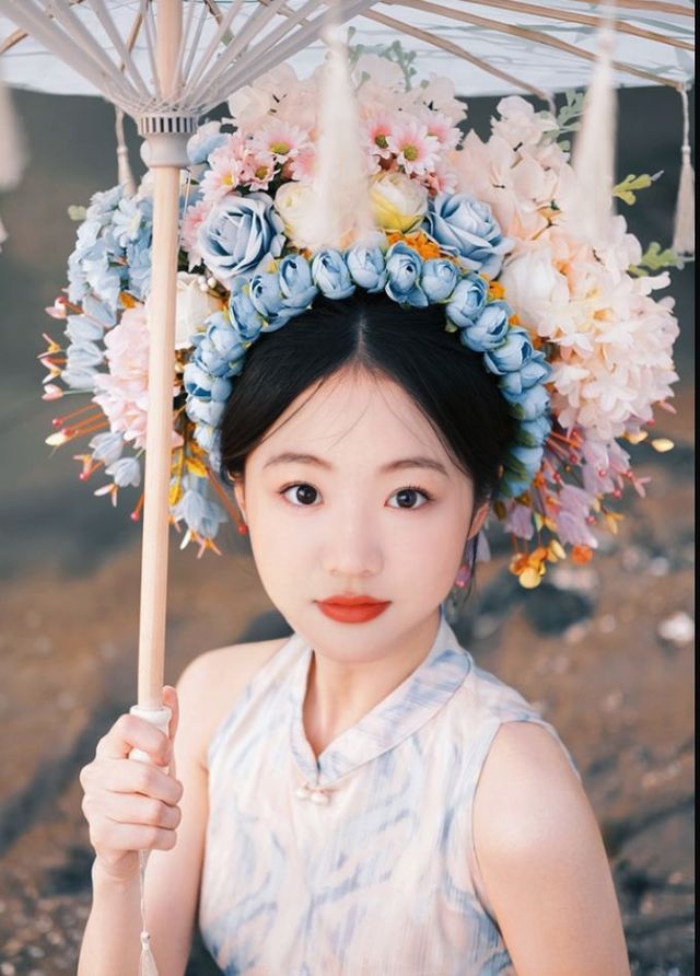 付了钱,簪花的奶奶就开始了工作,一点一点把花簪在了梓晨的头上