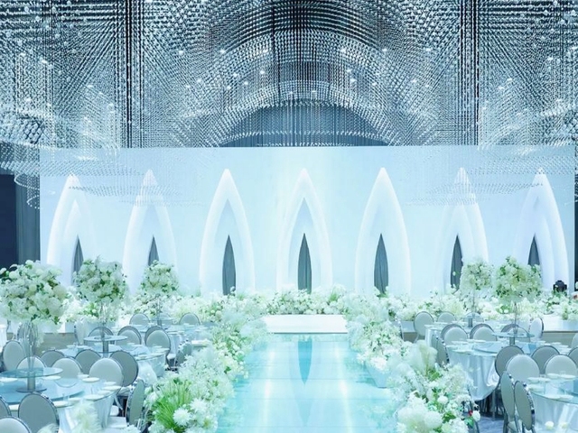 两人伴随主持人的指引宣誓,交换戒指,亲吻对方,敬酒