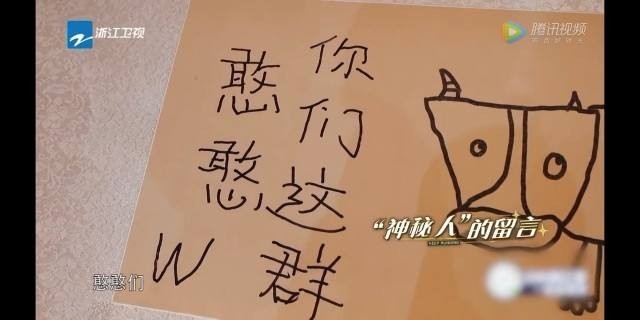 说归说闹归闹,节目的流程还是要往下cue,大家就派杨颖去打开玻璃箱拿出《五牛图》。谁能想到,这《五牛图》居然是低幼版的,上面还写了句,“你们这群憨憨 W”。李晨看见了哭笑不得