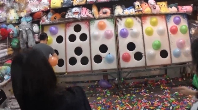 深呼一口气秦淼淼瞄准气球后丢出了第一个!
