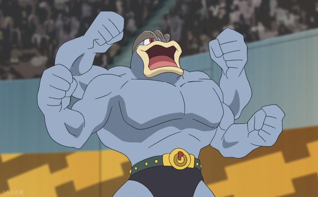 白光一闪,怪力张着满是肌肉的四只手臂出现在场地上,和它的训练家做着一样的动作。