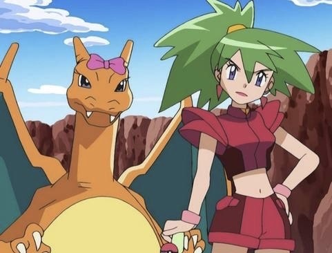 远方,一道橙红色的暗影正在朝这边飞来,仔细一看居然是一只喷火龙,上面还站着一个穿红色露肌装的女人。